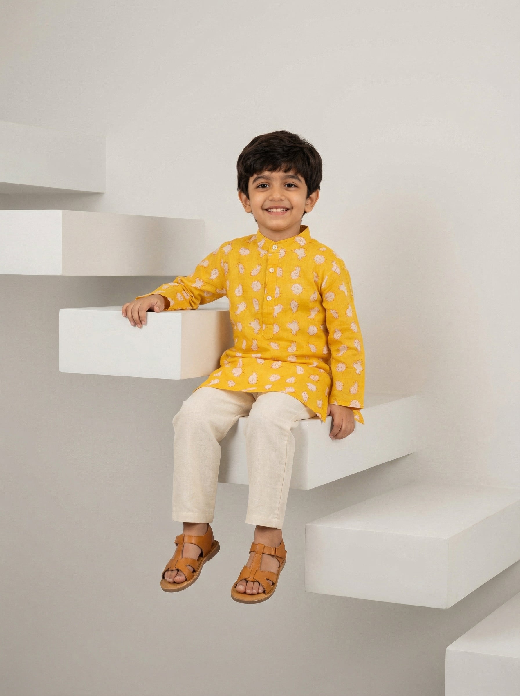 Featuring versatile and comfortable Block printed Kurtas. Available in a variety of colors and prints, these Kurtas offer a modern touch to your kid's wardrobe. They come with a Chinese Collar, Shell Front Buttons, and long sleeves with loop and button to fold it till elbows . Perfect for pairing with cotton pyjamas,  Denims or Cotton Trousers. Made of Pure Cotton, they are easy to care for with Hand Wash or Mild Machine Wash.