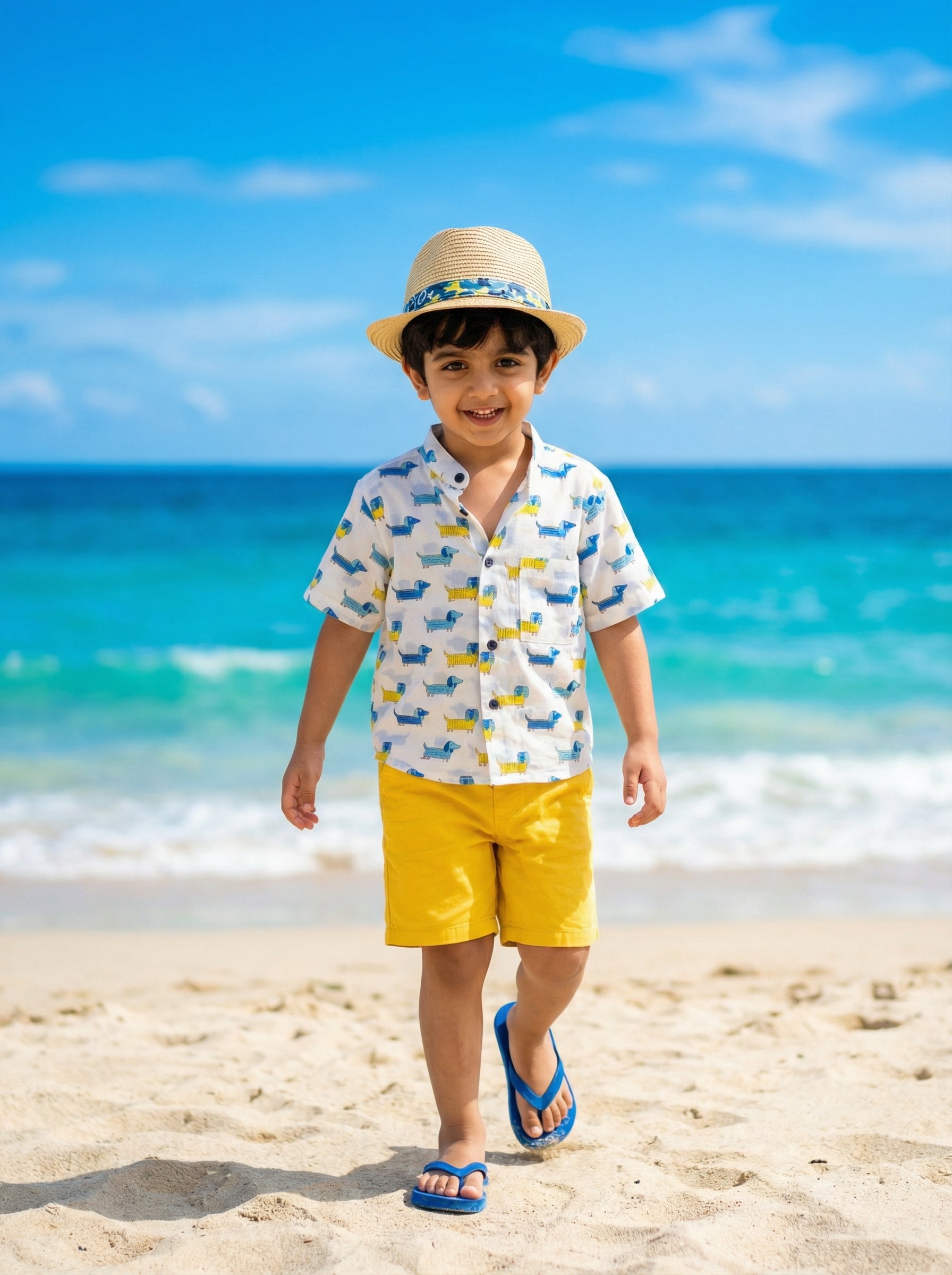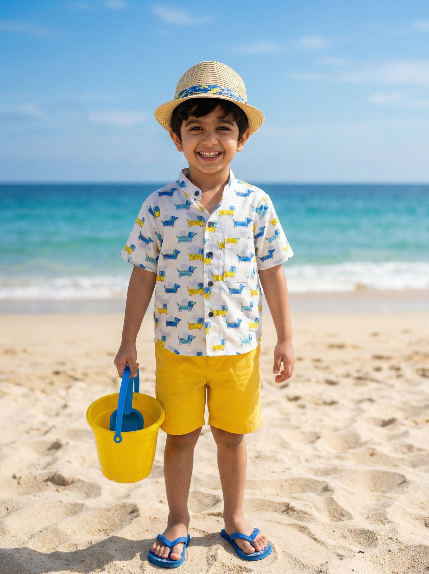 A Dachshund print shirt in pure cotton breathable fabric perfect for playdates and casual wear. Pair it up with shorts or our Dawn to Dusk cotton pants and your little one is ready to go.