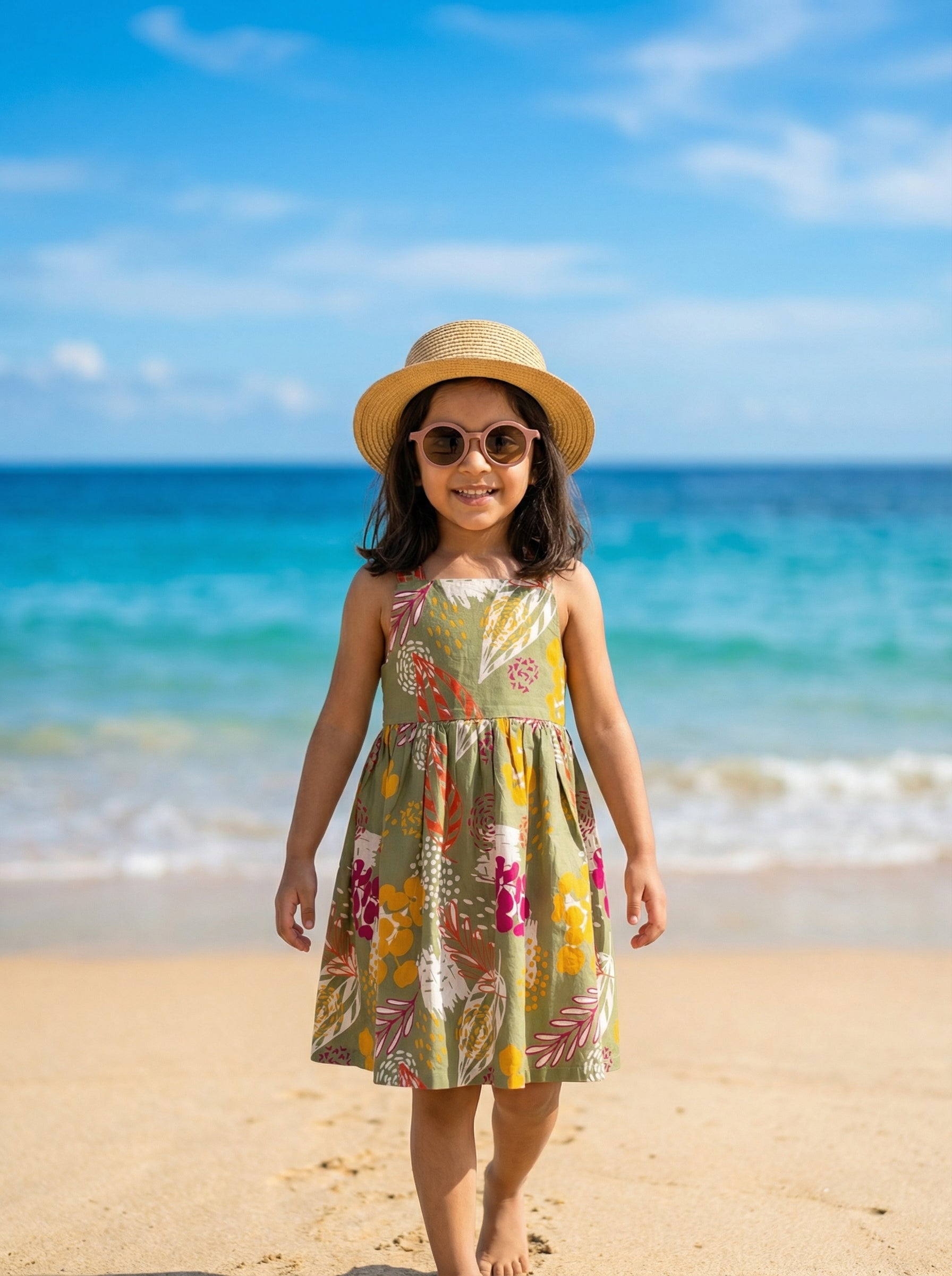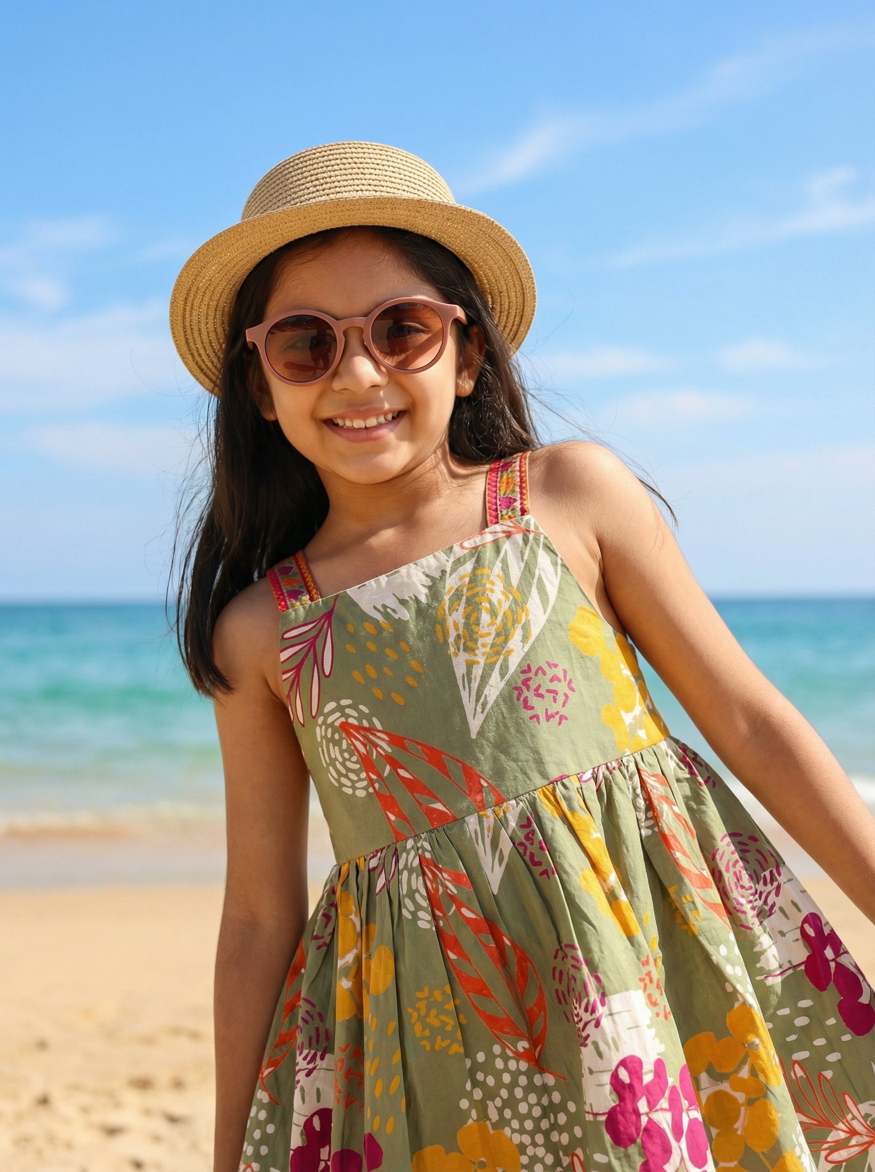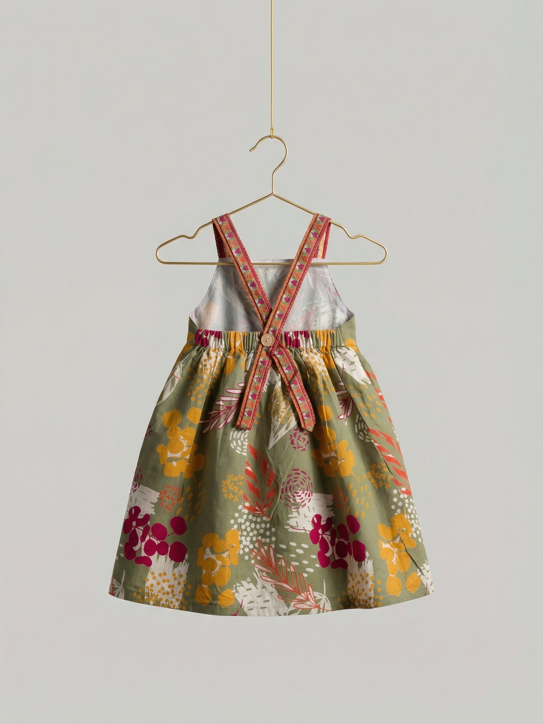 The Sage Green Dress with its vibrant print in golden yellow and magenta pops is for the little explorer who loves nature . The bohemian dress is perfect for the little one wandering in the parks, chasing butterflies or building sandcastles on the beach , collecting those shells and playing with sand.